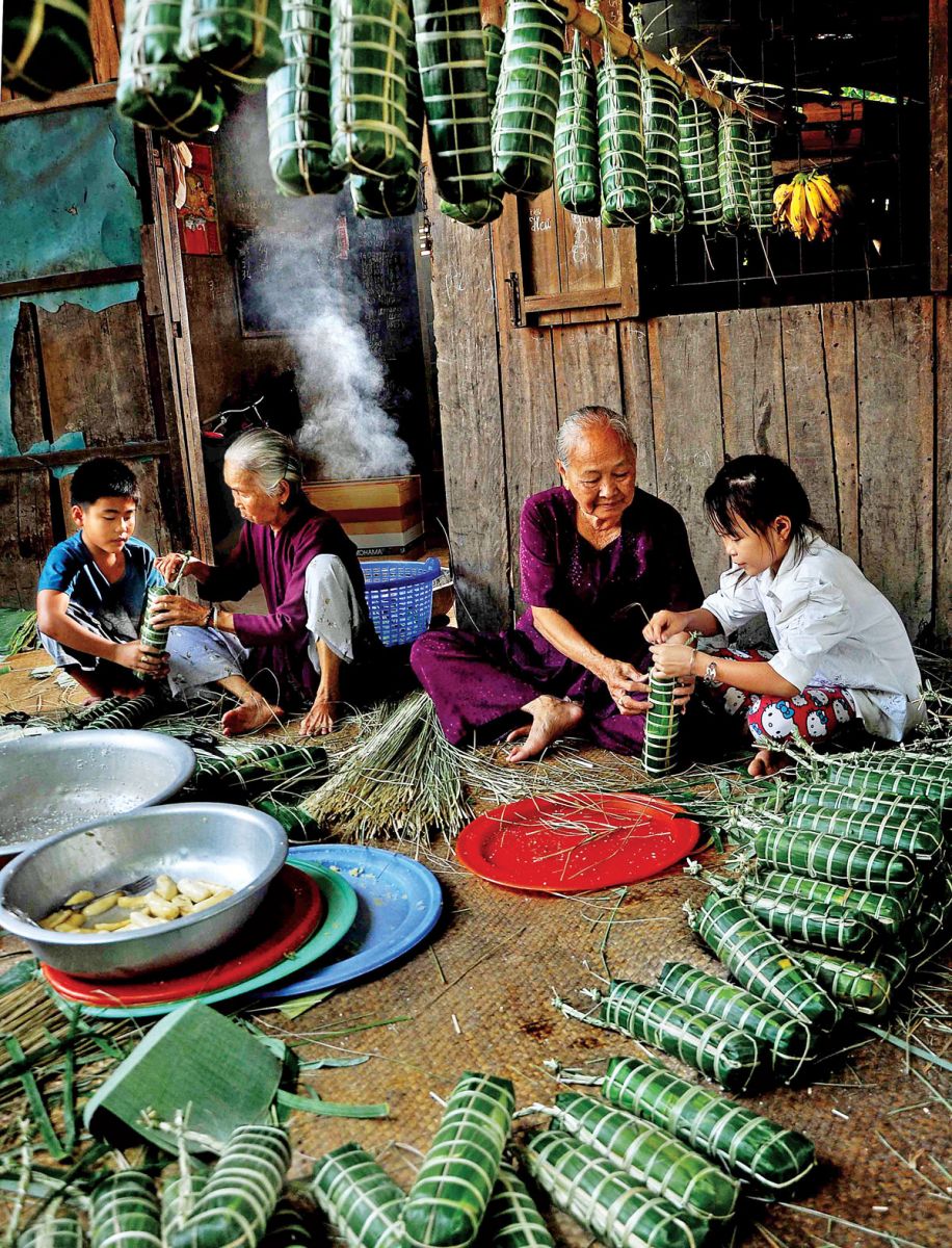 Đêm 29 tết, nhà nào cũng lục đục gói bánh ít, bánh tét. Vui lắm, tụi nhỏ hý hoáy lau lá chuối, chuẩn bị lạt buộc, cha bắc cái bếp ra sau hè chuẩn bị nấu bánh. Má và các chị cùng nhau gói bánh đến khuya, cười nói rôm rả. Đêm, sương xuống, tụi nhỏ vây quanh bếp lửa tí tách kể chuyện được may áo mới và cố gắng học thuộc những bài đồng dao chúc tết.