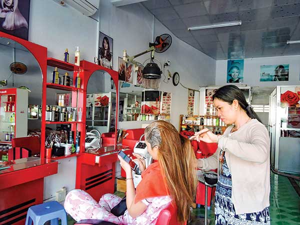 Nhờ nguồn vốn vay của nhóm Phụ nữ tiết kiệm, chị Nguyện (đứng) phát triển cửa tiệm làm đẹp khang trang.