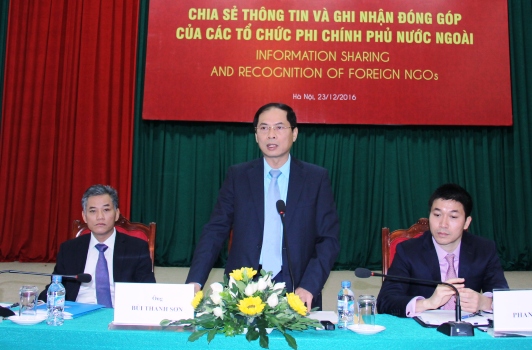 Phát biểu khai mạc Hội nghị, Thứ trưởng Thường trực Bộ Ngoại giao, Chủ nhiệm Uỷ ban Công tác về các tổ chức phi chính phủ nước ngoài Bùi Thanh Sơn nhấn mạnh, Hội nghị chia sẻ thông tin và ghi nhận đóng góp của các tổ chức phi chính phủ nước ngoài tại Việt Nam năm 2016 được tổ chức trên tinh thần mong muốn kết nối, tạo môi trường thuận lợi nhất cho các tổ chức phi chính phủ nước ngoài đóng góp vào công cuộc phát triển kinh tế - xã hội của Việt Nam. Hội nghị là dịp để các tổ chức phi chính phủ nước ngoài cập nhật những thông tin mới và chính xác nhất về các quy định liên quan đến thủ tục hành chính...; được giải đáp thắc mắc để hoạt động tích cực và hiệu quả hơn.