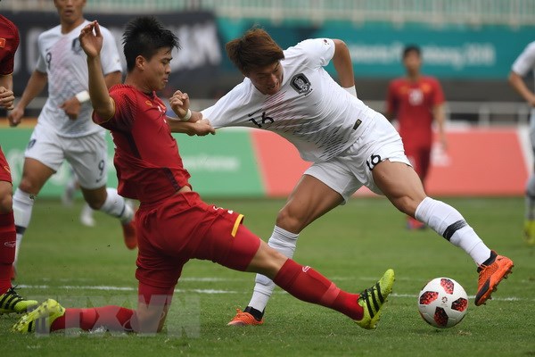 Pha tranh bóng quyết liệt giữa Đỗ Duy Mạnh (trái) với cầu thủ Olympic Hàn Quốc Hwang Ui-jo. (Nguồn: AFP/TTXVN)
