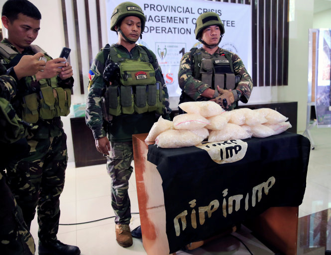 Hàng chục ký ma túy loại nặng Shabu và một lá cờ của IS được thu giữ khi khám xét một vị trí ẩn nấp của khủng bố Maute ở Marawi. Số ma túy này nếu được bán ra có thể đem về cho bọn Maute ít nhất từ 2,5 đến 5 triệu USD - Ảnh: Reuters