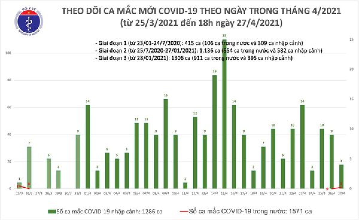 - CA BỆNH 2853 (BN2853) cách ly ngay sau nhập cảnh tại Thái Nguyên: Bệnh nhân nữ, 25 tuổi, là công dân Việt Nam, có địa chỉ tại huyện Đan Phượng, thành phố Hà Nội. Ngày 23/4/2021, bệnh nhân từ Nhật Bản nhập cảnh Sân bay Nội Bài trên chuyến bay JL751 và được cách ly ngay sau khi nhập cảnh tại Thái Nguyên. Kết quả xét nghiệm ngày 26/4/2021 bệnh nhân dương tính với virus SARS-CoV-2. Hiện bệnh nhân được cách ly, điều trị tại Bệnh viện Bệnh nhiệt đới Trung ương cơ sở Đông Anh.