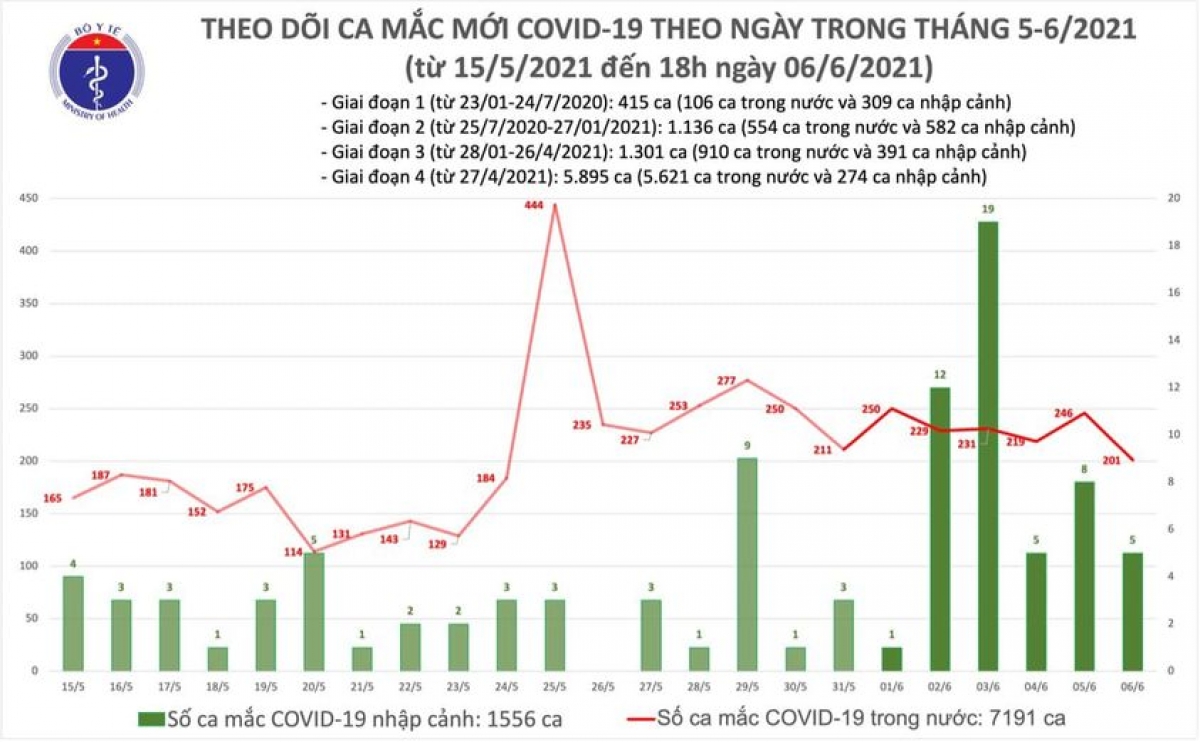 Trong ngày 6/6, Việt Nam ghi nhận tổng cộng 201 ca mắc mới ghi nhận trong nước tại Bắc Giang (121), Bắc Ninh (40), TP. Hồ Chí Minh (31), Hà Tĩnh (5), Hà Nội (2), Bình Dương (2); trong đó 198 ca được phát hiện trong khu cách ly hoặc khu đã được phong toả.