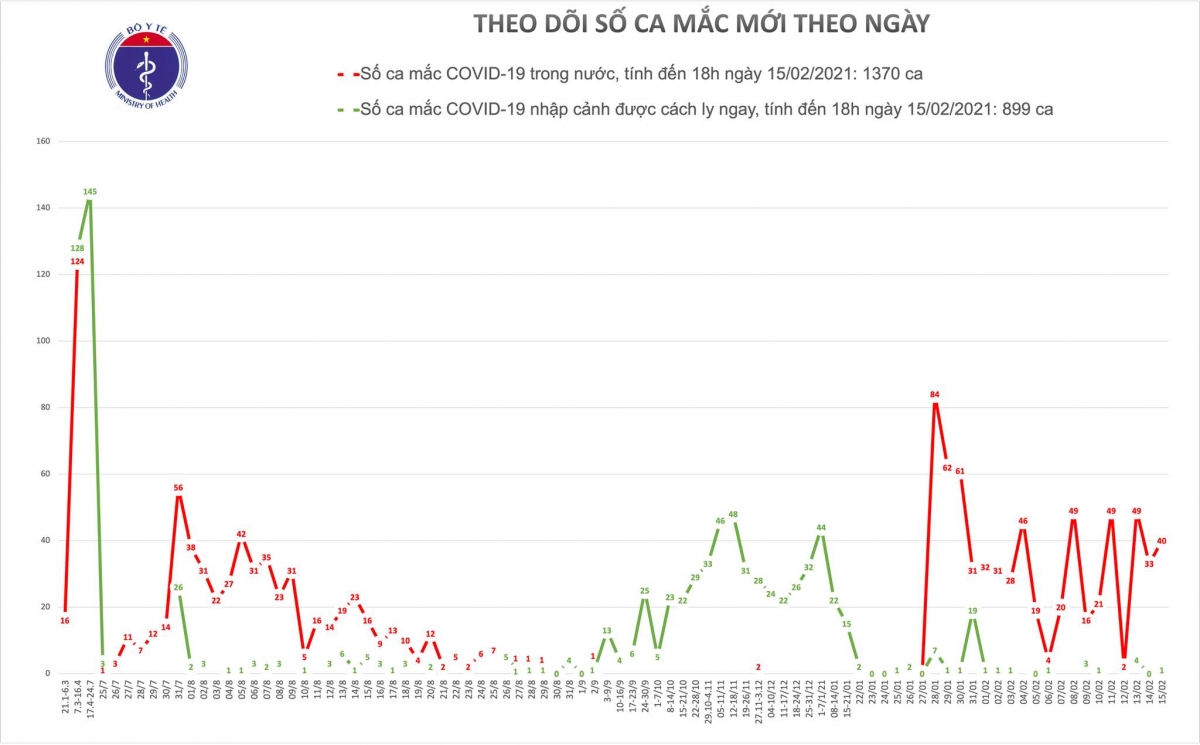 Bộ Y tế cho biết, tính đến 18h ngày 15/2: Việt Nam có tổng cộng 1370 ca mắc COVID-19 do lây nhiễm trong nước, trong đó số lượng ca mắc mới tính từ ngày 27/1 đến nay: 677 ca.