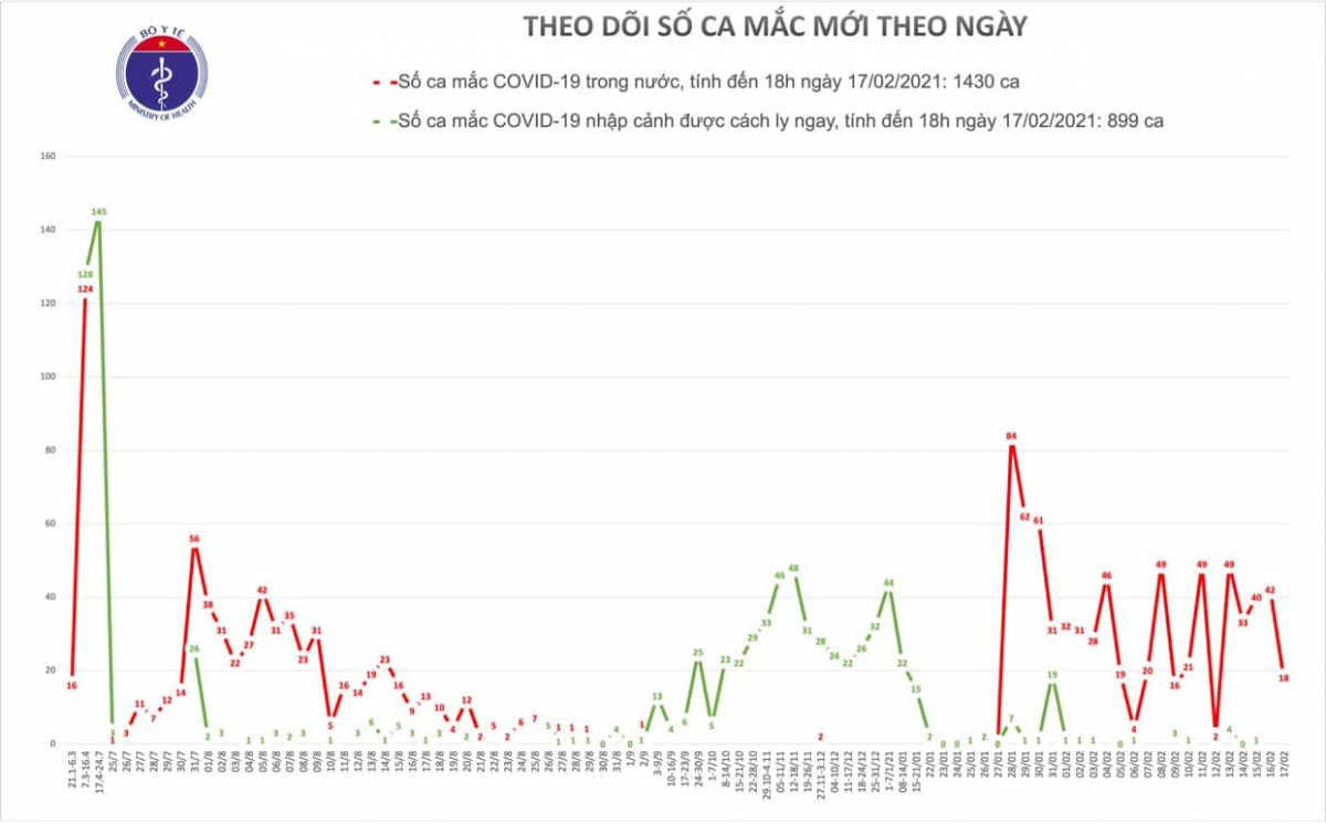 Tính đến 18h ngày 17/02: Việt Nam có tổng cộng 1430 ca mắc COVID-19 do lây nhiễm trong nước, trong đó số lượng ca mắc mới tính từ ngày 27/1 đến nay: 737 ca.