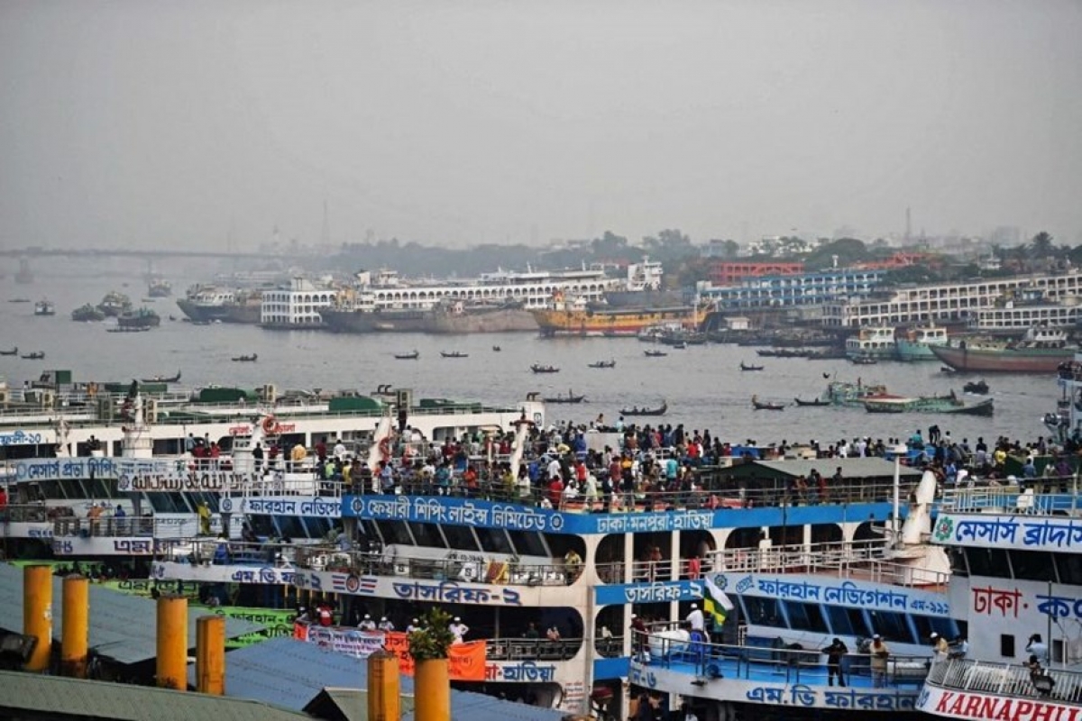 Người dân Bangladesh chen chúc trên những chuyến phà để trở về nhà ở Dhaka ngày 4/4/2021. Ảnh: AFP.
