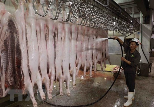 Làm sạch sản phẩm thịt lợn lần cuối để đưa vào chế biến. (Ảnh: Vũ Sinh/TTXVN)