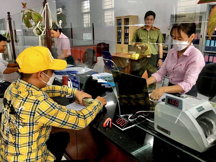 Phòng giao dịch NHCSXH quận Cái Răng phát vay vốn từ ngân sách địa phương đối với NCHXAPT trên địa bàn. Ảnh: Phương Mai