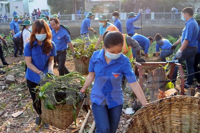 Đoàn viên thanh niên thu gom rác thải ở Thành phố Hồ Chí Minh. (Ảnh: An Hiếu/TTXVN)