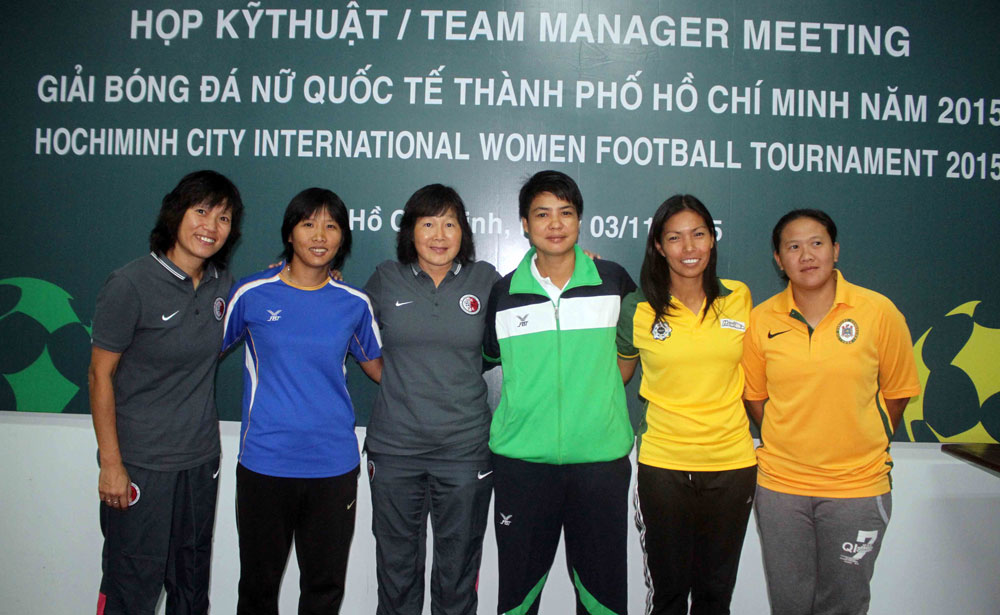 HLV Kim Chi (thứ hai từ trái sang) lại có dịp thể hiện mình ở Giải bóng đá nữ quốc tế TP.HCM 2015. Ảnh: N.K