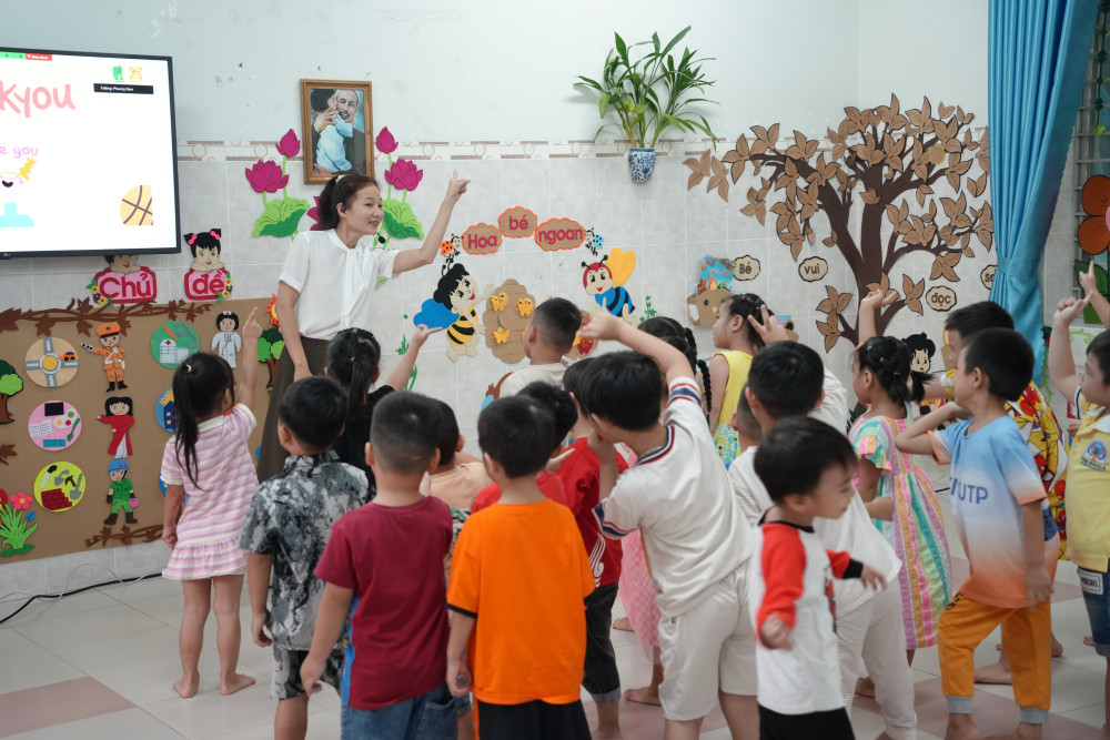 Bên cạnh nỗ lực của trường, GV trực tiếp dạy tiếng Anh cũng không ngừng đổi mới, áp dụng phương pháp dạy hay, hiệu quả. Cô Phùng Thị Ngọc Hảo - GV dạy tiếng Anh tại Trường Mầm non Hoa Hồng, chia sẻ: "Trong quá trình dạy tiếng Anh cho trẻ, tôi sử dụng nhiều phương pháp từ hình ảnh trực quan, âm nhạc đến tương tác bằng ứng dụng công nghệ thông tin. Ngoài ra, tôi còn tổ chức các hoạt động đội, nhóm nhằm tạo không khí vui tươi, giúp trẻ hứng thú học tập và có thể phát triển tối đa khả năng".
