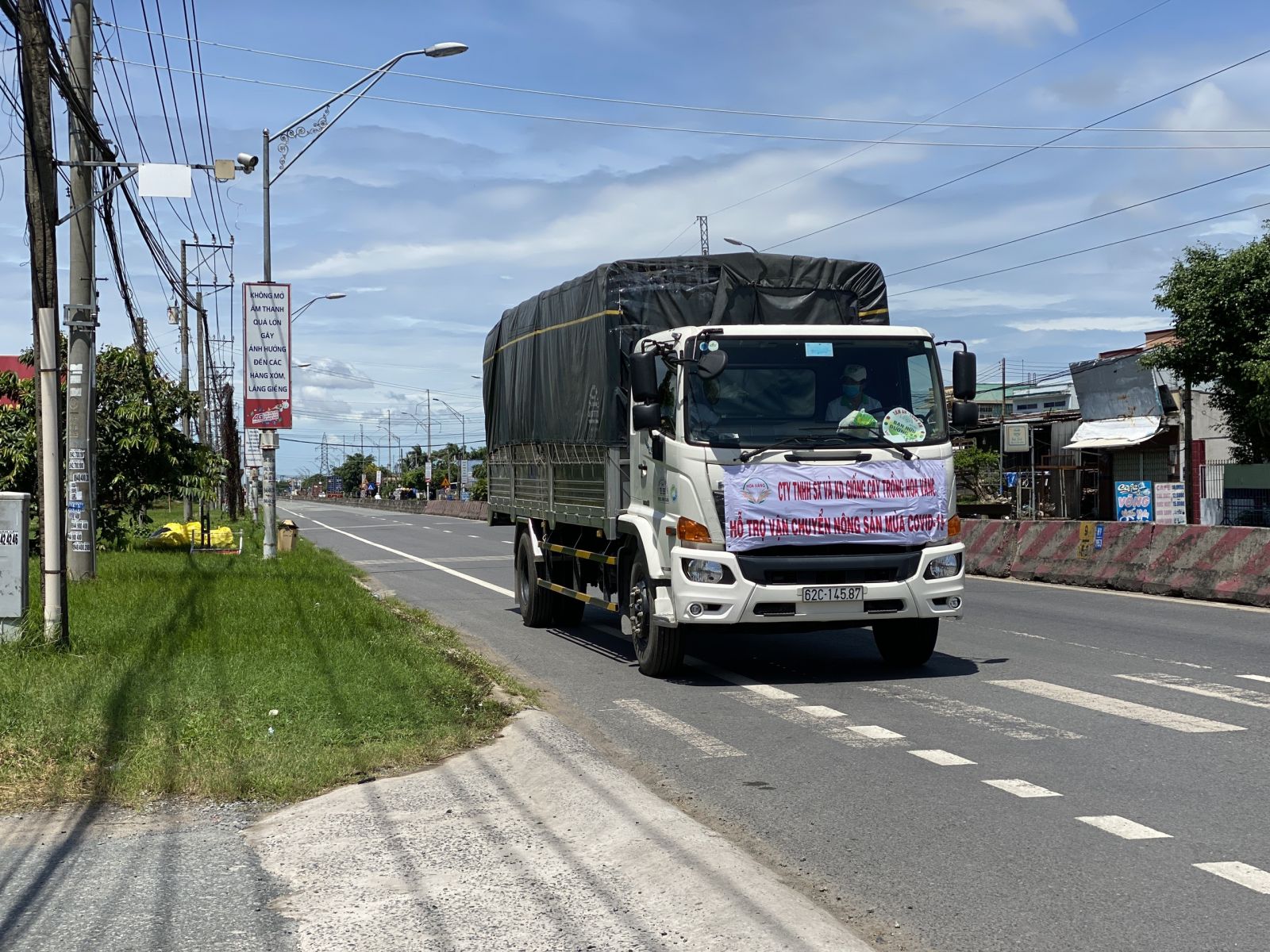 Xe tải của Công ty TNHH Sản xuất và Kinh doanh Giống cây trồng Hoa Vàng chở hàng miễn phí vào tâm dịch