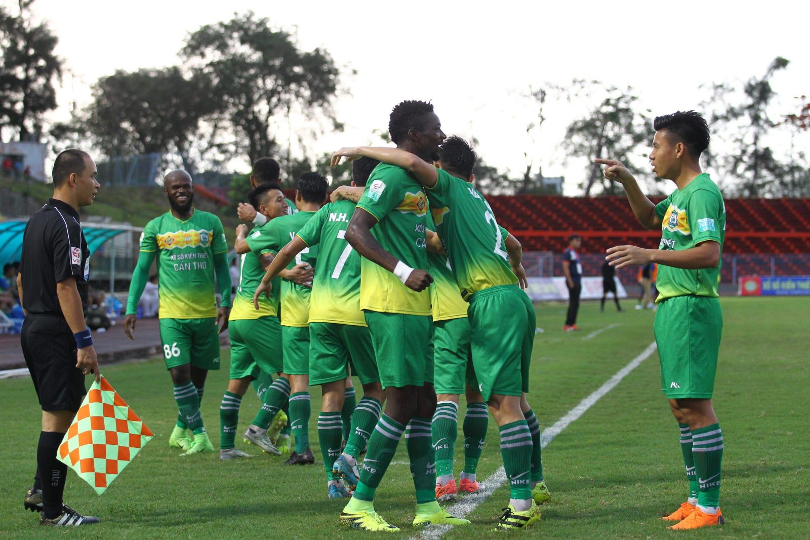 Các cầu thủ Cần Thơ mừng bàn thắng mở tỷ số của Patiyo.