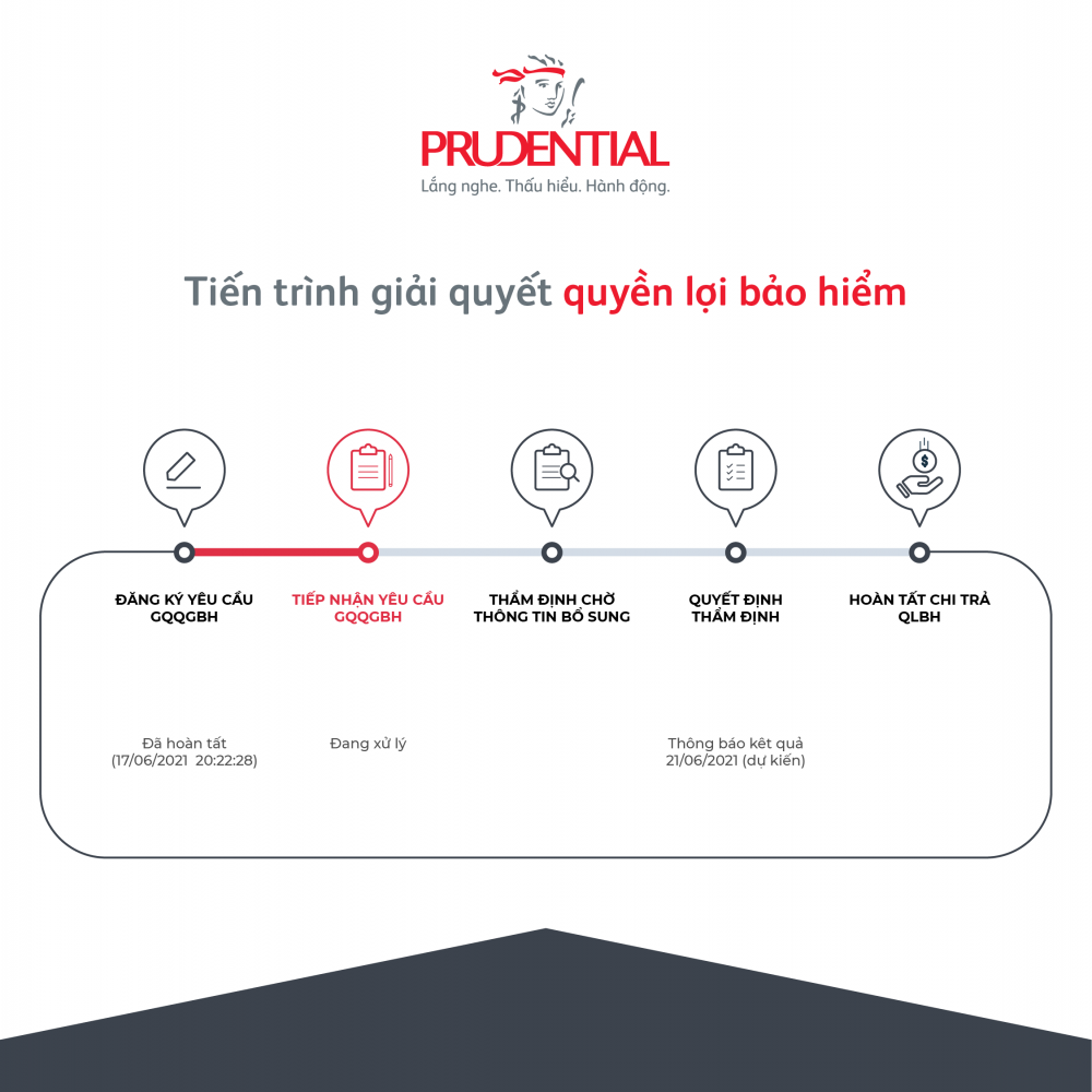 - Khách hàng được cập nhật chính xác tiến trình giải quyết yêu cầu bồi thường trên cổng thông tin khách hàng PruOnline và trang Zalo - Prudential Vietnam.