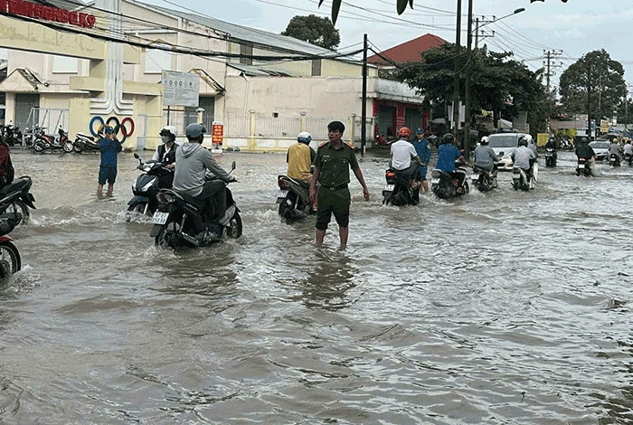 Lực lượng công an và bảo vệ dân phố phường Bùi Hữu Nghĩa, quận Bình Thủy hỗ trợ phân luồng giao thông để đảm bảo người dân lưu thông an toàn trong những ngày triều cường.