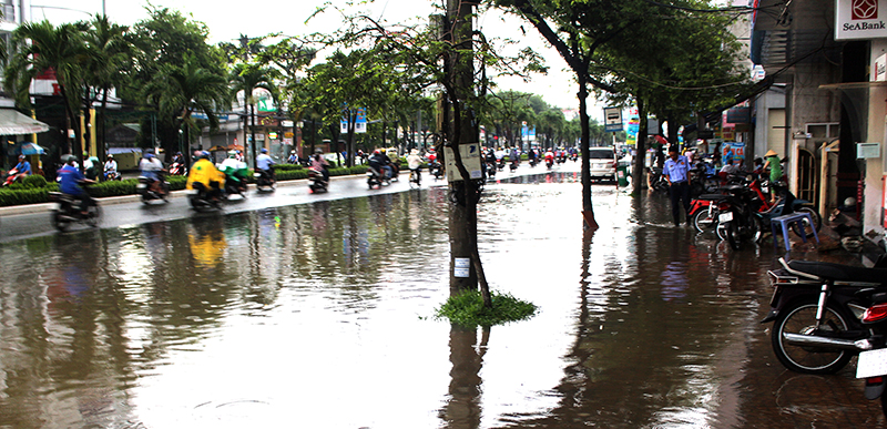 Đường 30 Tháng 4, quận Ninh Kiều thường xuyên bị ngập sâu do triều cường, ảnh hưởng giao thông, sinh hoạt, kinh doanh của người dân tại địa phương. Ảnh: HÀ VĂN