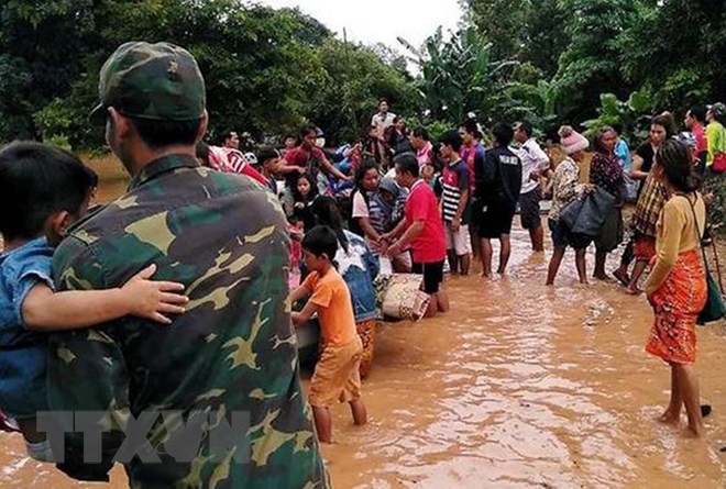 Người dân sơ tán khỏi các khu vực ngập lụt sau sự cố vỡ đập thủy điện Sapien. (Ảnh: Reuters/TTXVN)
