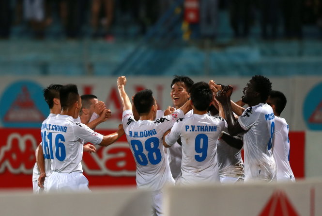 Các cầu thủ Hà Nội ăn mừng bàn thắng. Anh: Nam Khánh