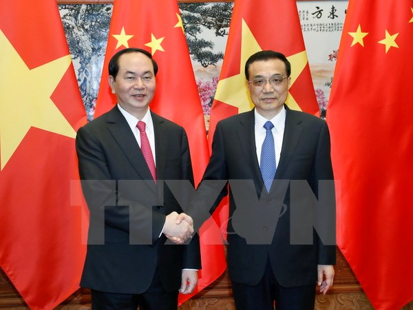 Chủ tịch nước Trần Đại Quang gặp Thủ tướng Trung Quốc Lý Khắc Cường. (Ảnh: Nhan Sáng/TTXVN)