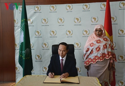 Chủ tịch nước Trần Đại Quang bày tỏ vui mừng lần đầu tiên dẫn đầu Đoàn đại biểu cấp cao Việt Nam đến thăm trụ sở của Liên minh châu Phi (AU). Chủ tịch nước chúc mừng thành tựu của nhân dân các nước Châu Phi trong phát triển kinh tế và duy trì môi trường hoà bình và ổn định ở Châu Phi; khẳng định Việt Nam và các nước châu Phi đã luôn sát cánh ủng hộ và tương trợ lẫn nhau trong cuộc đấu tranh giải phóng dân tộc trước đây và trong sự nghiệp phát triển kinh tế ngày nay.