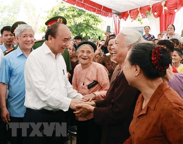 | Chủ tịch nước Nguyễn Xuân Phúc thăm hỏi nhân dân xã Tứ Xã, huyện Lâm Thao, tỉnh Phú Thọ. Ảnh: Thống Nhất/TTXVN |