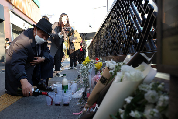 Người dân Hàn Quốc rót rượu, đặt hoa tại nơi gần hiện trường vụ giẫm đạp tối 29-10 - Ảnh: REUTERS