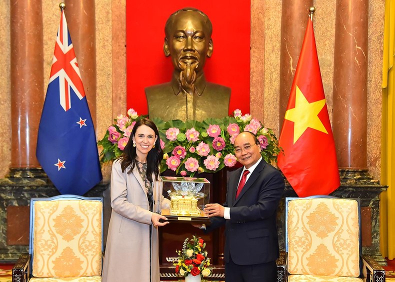 | Chủ tịch nước Nguyễn Xuân Phúc trao quà tặng Thủ tướng New Zealand Jacinda Ardern |