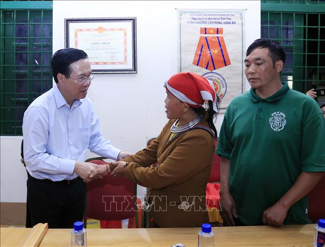 | Chủ tịch nước Võ Văn Thưởng thăm hỏi, tặng quà hộ gia đình bị thiệt hại sau trận lũ quét tại xã Liên Minh, thị xã Sa Pa, tỉnh Lào Cai. Ảnh: Thống Nhất – TTXVN |