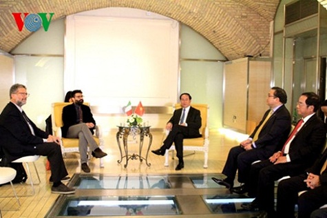 Tại các cuộc gặp, Chủ tịch nước Trần Đại Quang thông báo một số nội dung chính trong cuộc hội đàm với Tổng thống Italy vừa diễn ra; bày tỏ vui mừng trước bước phát triển mạnh mẽ của quan hệ hai nước trong nhiều lĩnh vực kể từ khi nâng cấp lên Đối tác chiến lược (tháng 1/2013); khẳng định Việt Nam coi trọng phát triển quan hệ Đối tác chiến lược với Italy, đối tác quan trọng của Việt Nam trong EU. Chủ tịch nước thông báo những định hướng phát triển kinh tế - xã hội và chính sách đối ngoại do Đại hội Đảng Cộng sản Việt Nam lần thứ 12 vạch ra; khẳng định Đảng Cộng sản Việt Nam trân trọng quan hệ hữu nghị truyền thống với các đảng cánh tả Italy; bày tỏ cảm ơn sâu sắc đối với tình đoàn kết, sự ủng hộ và giúp đỡ quý báu của lực lượng cánh tả, những người Cộng sản và nhân dân Italy đã và đang dành cho Việt Nam; nhấn mạnh chủ trương duy trì, củng cố và tăng cường quan hệ với các đảng bạn bè, truyền thống, đồng thời mở rộng quan hệ với các đảng chính trị lớn, đảng cầm quyền tại các nước. Chủ tịch nước thông báo kết quả cuộc gặp gỡ lần thứ 18 các Đảng cánh tả tại Việt Nam tháng 10/2016 vừa qua, chia sẻ quyết tâm của các Đảng cánh tả đấu tranh vì hoà bình, độc lập, công bằng, dân chủ, văn minh và chủ nghĩa xã hội. Chủ tịch nước bày tỏ mong muốn thời gian tới, các đảng cánh tả Italy và Đảng Cộng sản Việt Nam sẽ tăng cường gặp gỡ tiếp xúc, trao đổi kinh nghiệm, giúp đỡ và ủng hộ lẫn nhau vì những mục tiêu chung, góp phần làm sâu sắc thêm và hiện thực hoá mối quan hệ Đối tác chiến lược giữa Việt Nam và Italy, mời các đồng chí Lãnh đạo các Đảng cánh tả sang thăm Việt Nam. Lãnh đạo Đảng Dân chủ Italy, Đảng Tái lập Cộng sản Italy, Đảng Cộng sản Italy bày tỏ vui mừng được hội kiến Chủ tịch nước Trần Đại Quang, khẳng định tình đoàn kết, hữu nghị mà các Đảng cánh tả Italia luôn dành cho sự nghiệp đấu tranh giải phóng đất nước trước đây và xây dựng tổ quốc hiện nay của Việt Nam./.