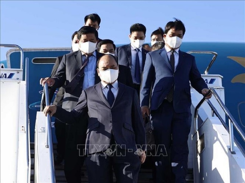 Đại sứ Việt Nam tại Nhật Bản Vũ Hồng Nam và Phu nhân cùng một số cán bộ, nhân viên Đại sứ quán đón Chủ tịch nước Nguyễn Xuân Phúc và đoàn tại sân bay.