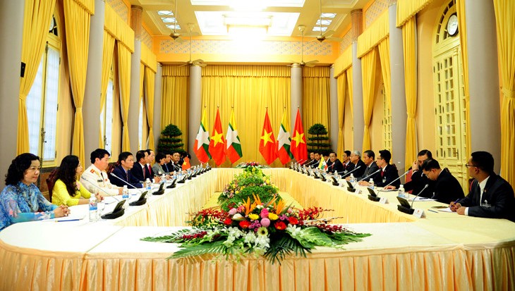 Chủ tịch nước Trần Đại Quang và Tổng thống Mi-an-ma U Tin Chô bày tỏ hài lòng về sự phát triển của quan hệ hữu nghị truyền thống và hợp tác nhiều mặt của hai nước trong hơn 40 năm qua, trên cơ sở nền tảng được Chủ tịch Hồ Chí Minh và anh hùng Ong San (Aung San) gây dựng. Hợp tác chính trị đã có được sự hiểu biết và tin cậy quan trọng với việc hai bên trao đổi các chuyến thăm và tiếp xúc cấp cao. Quan hệ kinh tế, thương mại-đầu tư phát triển vững chắc. Việt Nam hiện là đối tác thương mại-đầu tư lớn thứ 10 của Mi-an-ma. Hai bên đang tích cực triển khai 12 lĩnh vực ưu tiên là nông nghiệp, cây công nghiệp, thủy sản, tài chính-ngân hàng, hàng không, viễn thông, dầu khí, khai khoáng, sản xuất thiết bị điện, chế tạo và lắp ráp ô tô, xây dựng và hợp tác thương mại-đầu tư.