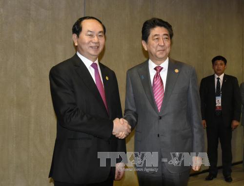 Bày tỏ vui mừng lần đầu tiên gặp Chủ tịch nước Trần Đại Quang, Thủ tướng Sinzo Abe khẳng định, Nhật Bản mong muốn tăng cường hơn nữa quan hệ hợp tác nhiều mặt với Việt Nam, đặc biệt trong lĩnh vực xây dựng cơ sở hạ tầng chất lượng cao. Thủ tướng Sinzo Abe thông báo, Nhật Bản đã quyết định viện trợ cho Việt Nam một số phương tiện phòng chữa cháy và xe cứu hộ, tiếp tục hỗ trợ Việt Nam tăng cường năng lực cho các lực lượng chấp pháp trên biển. Đánh giá cao sự phối hợp chặt chẽ giữa hai nước tại các diễn đàn đa phương, Thủ tướng Sinzo Abe khẳng định, Nhật Bản ủng hộ và sẽ hỗ trợ tích cực để Việt Nam tổ chức thành công Năm APEC 2017.
