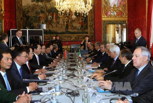 Sau lễ đón, tại Phủ Tổng thống ở thủ đô Rome, Chủ tịch nước Trần Đại Quang và Tổng thống Sergio Mattarella đã tiến hành hội đàm.