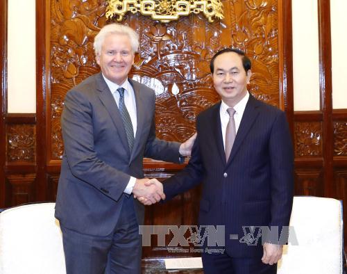 Bày tỏ vui mừng trở lại thăm Việt Nam, Chủ tịch GE Jeffrey R. Immelt chia sẻ với Chủ tịch nước Trần Đại Quang những ấn tượng về sự phát triển kinh tế - xã hội của Việt Nam. Về hoạt động của GE tại Việt Nam, ông Jeffrey R. Immelt cho biết, GE hiện đang triển khai việc đầu tư, vận hành các cơ sở sản xuất tại Việt Nam, với nhà máy sản xuất tua-bin điện gió, tua-bin động cơ hơi nước cung cấp cho các trung tâm sản xuất, dịch vụ của GE tại Việt Nam và trên toàn cầu. Trên bình diện là một tập đoàn toàn cầu, GE đánh giá cao sự sáng tạo, tinh thần lao động của công nhân Việt Nam, góp phần vào thành công chung của Tập đoàn GE hiện nay.