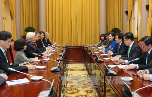 Chủ tịch nước bày tỏ vui mừng được đón bà Tổng Giám đốc đến Việt Nam sau 10 năm kể từ chuyến thăm của ngài Tổng Giám đốc IMF tiền nhiệm. Hoan nghênh sự giúp đỡ hết sức quan trọng của tổ chức tài chính thế giới cho công cuộc phát triển kinh tế xã hội với Việt Nam, Chủ tịch nước đánh giá sự giúp đỡ của IMF trên nhiều lĩnh vực, đặc biệt là vay ưu đãi và tư vấn chính sách. Chủ tịch nước cảm ơn những đánh giá chân tình và hữu ích của IMF về phát triển kinh tế Việt Nam. Chủ tịch nước cho biết, với mục tiêu GDP khoảng 6% trong giai đoạn tới, Việt Nam coi trọng chất lượng tăng trưởng. Trong tiến trình cải cách mạnh mẽ kinh tế, Việt Nam sẽ tập trung tái cấu trúc ngân hàng, đổi mới doanh nghiệp Nhà nước, thúc đẩy mạnh mẽ hơn phát triển kinh tế tư nhân, tập trung thu hút đầu tư nước ngoài. Song song với quá trình đó, Việt Nam sẽ chuyển đổi mạnh mẽ kinh tế nông nghiệp. Trong tiến trình này, Việt Nam trân trọng và mong muốn Quỹ tiền tệ Quốc tế sẽ đóng góp cho Việt Nam những khuyến nghị thẳng thắn; đồng thời hỗ trợ Việt Nam trong việc tìm nguồn vốn vay ưu đãi hơn, phục vụ cho quá trình phát triển kinh tế bền vững.
