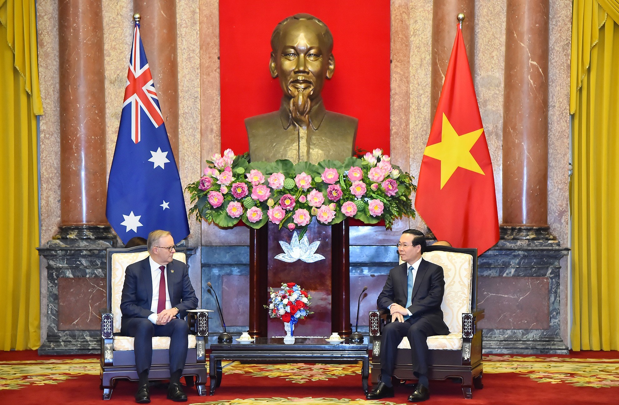 Chủ tịch nước Võ Văn Thưởng hoan nghênh Ngài Anthony Albanese lần đầu tiên sang thăm chính thức Việt Nam trên cương vị Thủ tướng; nhấn mạnh cùng với chuyến thăm Việt Nam tháng 4/2023 của Toàn quyền Australia David Hurley, chuyến thăm lần này của Thủ tướng Anthony Albanese đã góp phần tạo xung lực mới cho quan hệ Đối tác Chiến lược trong bối cảnh hai nước đang kỷ niệm 50 năm thiết lập quan hệ ngoại giao (1973-2023). Chủ tịch nước đánh giá cao Australia luôn dành cho Việt Nam nguồn ODA ổn định và đã tích cực hỗ trợ Việt Nam phòng, chống dịch bệnh COVID-19 thông qua việc kịp thời hỗ trợ vắc-xin với số lượng lớn.