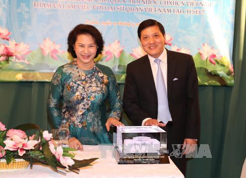 Chủ tịch Quốc hội Nguyễn Thị Kim Ngân đã nghe Đại sứ Việt Nam Trương Mạnh Sơn báo cáo một số nét chính về công tác của Đại sứ quán Việt Nam thời gian qua; trong đó, năm 2016 là năm ngoại giao phục vụ phát triển kinh tế của Đại sứ quán, các lĩnh vực như: hợp tác giáo dục, đào tạo, du lịch và lao động được triển khai tích cực. Đại sứ quán phối hợp các cơ quan chức năng của Séc có những hoạt động hỗ trợ chính sách cho cộng đồng người Việt Nam hội nhập và có đóng góp vào sự phát triển của xã hội sở tại. Đại sứ quán còn phối hợp cùng các Hội đoàn người Việt Nam tại Séc tổ chức nhiều hoạt động góp phần nâng cao đời sống văn hóa, tinh thần, tăng tình đoàn kết, tương trợ lẫn nhau trong cộng đồng; có những hoạt động hướng về quê hương đất nước.
