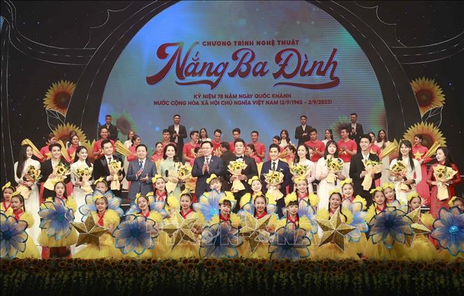 | Chủ tịch Quốc hội Vương Đình Huệ tặng hoa các nghệ sĩ biểu diễn tại Chương trình nghệ thuật “Nắng Ba Đình”. (Ảnh: Doãn Tấn - TTXVN) |