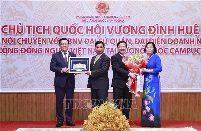 Chủ tịch Quốc hội Vương Đình Huệ đồng thời biểu dương đánh giá cao nỗ lực của Đại sứ quán Việt Nam tại Campuchia trong bảo hộ công dân, đồng thời trao tặng Quỹ hỗ trợ di dời bà con người Việt sinh sống vùng hồ, sông lên bờ sinh sống món quà trị giá 30.000 USD, Văn phòng Quốc hội tặng 5.000 USD tặng Hội Khmer-Việt Nam tại Campuchia./.