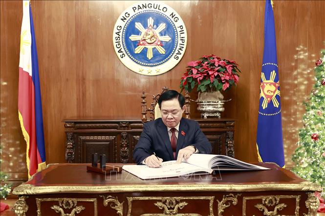 | Chủ tịch Quốc hội Vương Đình Huệ ký sổ vàng lưu niệm tại Dinh Tổng thống Philippines. Ảnh: Doãn Tấn/TTXVN |