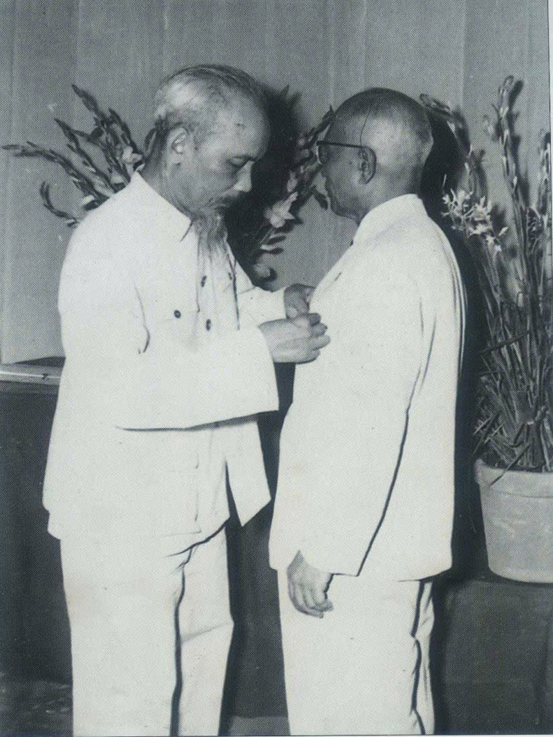 | Ngày 19/8/1958, Hồ Chủ tịch trao Huân chương Sao Vàng cho Bác Tôn nhân dịp Bác Tôn 70 tuổi (Ảnh: Tư liệu) |