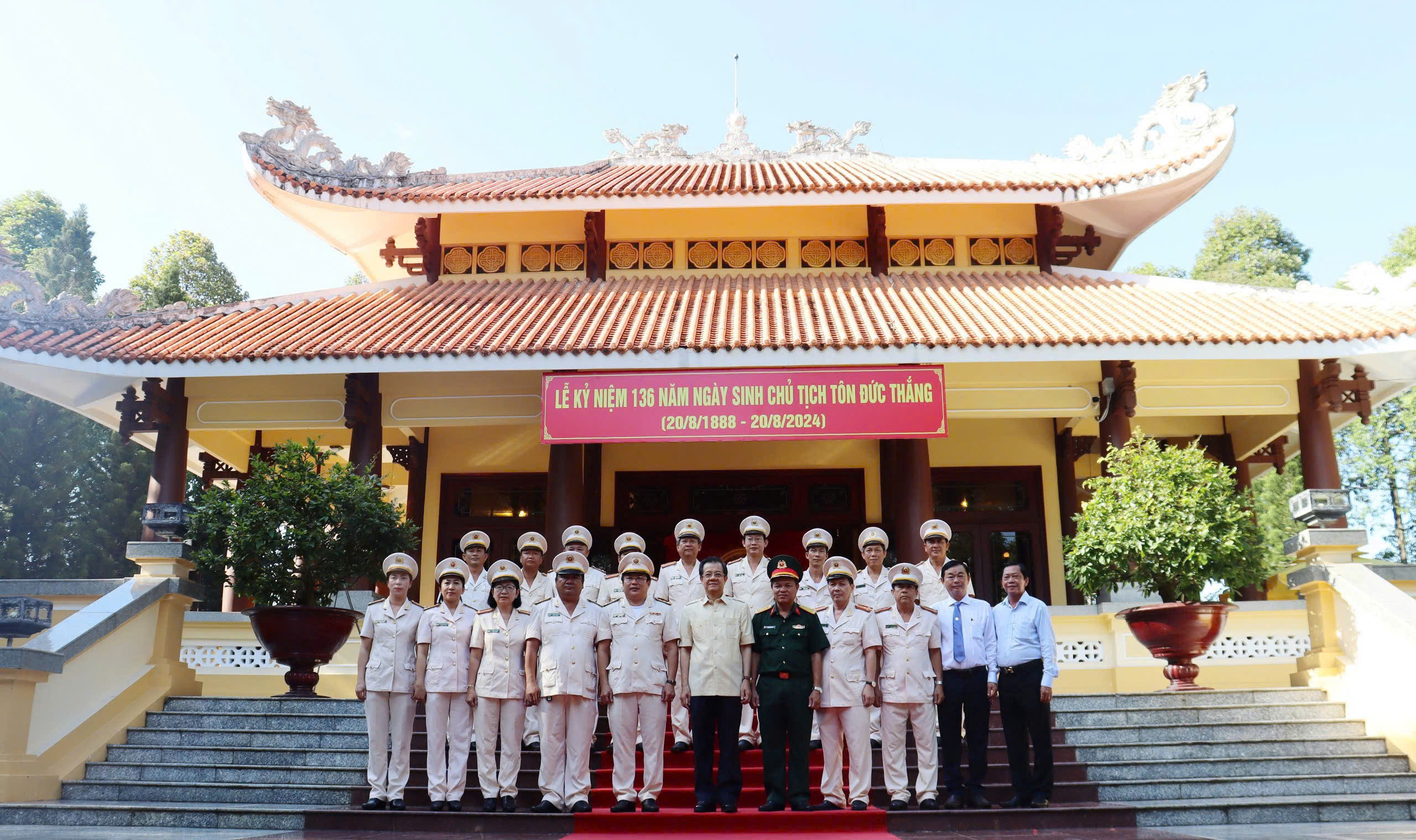 | Lãnh đạo tỉnh An Giang và đại biểu lực lượng vũ trang tỉnh An Giang trước Nhà lưu niệm Chủ tịch Tôn Đức Thắng |