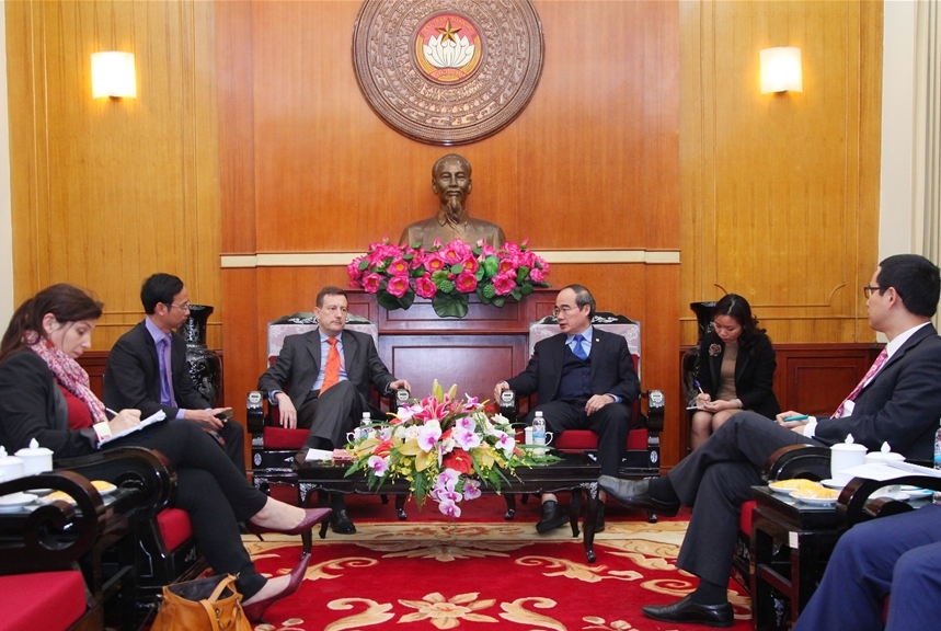 Chủ tịch Ủy ban Trung ương MTTQ Việt Nam Nguyễn Thiện Nhân tiếp Đại sứ Cộng hòa Pháp Bertrand Lortholary. Ảnh: Minh Châu