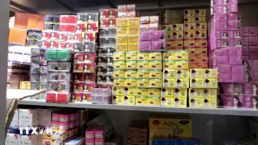 Số lượng lớn mỹ phẩm không rõ nguồn gốc bị lực lượng chức năng tạm giữ. (Ảnh: TTXVN)
