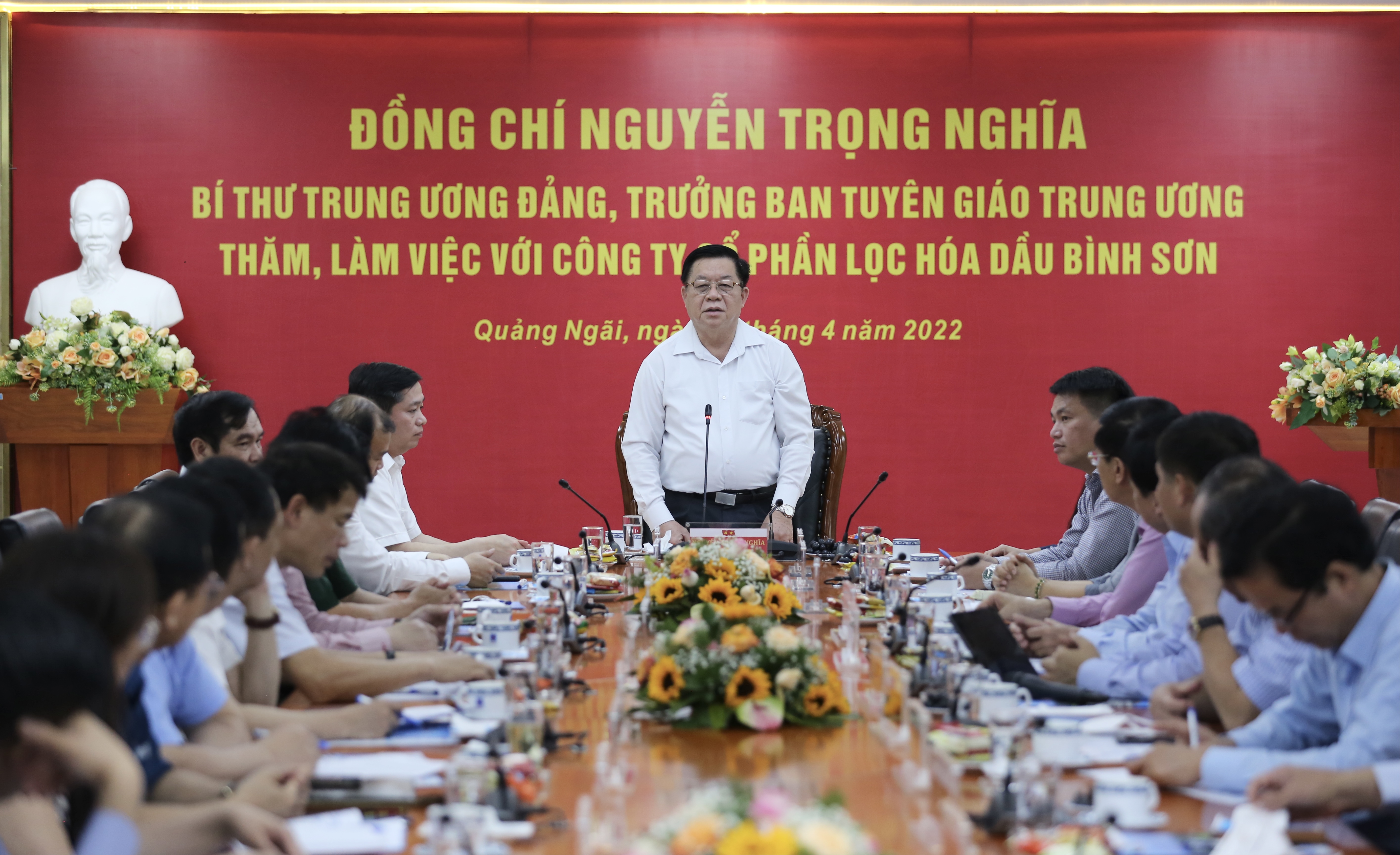 Phát biểu tại buổi làm việc, đồng chí Nguyễn Trọng Nghĩa, Bí thư Trung ương Đảng, Trưởng Ban Tuyên giáo Trung ương ghi nhận và đánh giá cao những kết quả tích cưc mà Công ty cổ phần Lọc hóa dầu Bình Sơn đã đạt được trong thời gian qua. Đồng chí cho rằng, không chỉ sản xuất kinh doanh mà Công ty cổ phần Lọc hóa dầu Bình Sơn còn tham gia nhiều hoạt động an sinh xã hội có ý nghĩa. Đây là điều đáng quý mà đơn vị nói riêng và ngành Dầu khí nước nhà luôn chú trọng thực hiện, góp phần cùng xã hội hướng đến các đối tượng khó khăn.