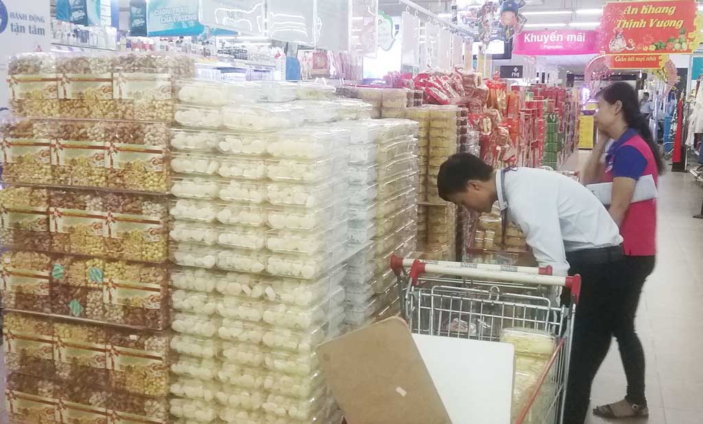 Đến siêu thị Co.op Mart Tân An vào những ngày này, chúng tôi ghi nhận được không khí nhộn nhịp, tất bật của các nhân viên để chuẩn bị trưng bày hàng hóa nhằm phục vụ nhu cầu mua sắm của người tiêu dùng trong dịp tết. Phó Giám đốc siêu thị Co.opMart Tân An - Nguyễn Thị Hòa Tiên cho biết: Vào khoảng 15-12-2015, siêu thị tập trung chuẩn bị nguồn hàng phục vụ cho người dân dịp tết dương lịch, lượng hàng hóa tăng lên từ 25-30% so với ngày thường. Tổng nguồn vốn dự trữ cho tất cả các mặt hàng phục vụ tết vào khoảng 40-50 tỉ đồng.Những mặt hàng được siêu thị tăng cường gồm bánh, kẹo, mứt, lạp xưởng, nước giải khát, hàng đóng gói, hàng thực phẩm tươi sống của Vissan.