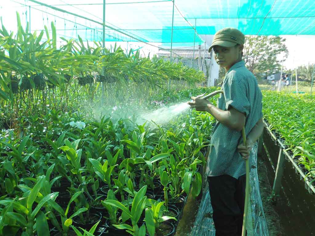 Nông dân đang chăm sóc hoa lan tại ấp Tân Điền, xã Long Thượng, huyện Cần Giuộc để kịp ra hoa vào mùa Tết.
