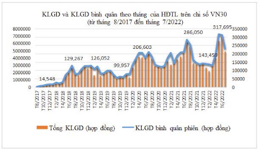 Bảng thống kê Khối lượng giao dịch bình quân của HĐTL trên chỉ số VN30 (từ tháng 8/2017 - tháng 7/2022)