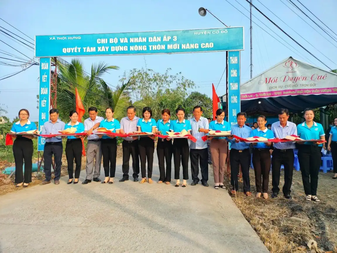 Thường trực Huyện ủy Cờ Đỏ và đại diện Hội LHPN huyện Cờ Đỏ cắt băng khánh thành công trình “Tuyến đèn đường trước ngỏ sáng - xanh - sạch - đẹp” tại tổ 1, ấp 3, xã Thới Hưng. Ảnh: Hội LHPN huyện Cờ Đỏ cung cấp.