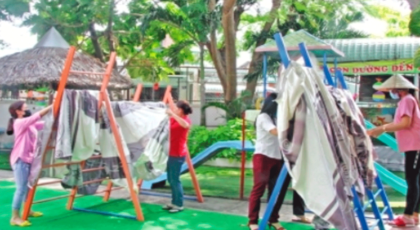 Hiệu trưởng Trường Mẫu giáo Vành Khuyên - Nguyễn Thụy Đài Trang cho biết: “Dù trẻ được nghỉ học nhưng Ban Giám hiệu, giáo viên, nhân viên vẫn đến trường và nỗ lực trong công tác phòng, chống dịch bệnh. Mỗi người mỗi việc, các cô giáo phụ trách vệ sinh lớp học, đồ dùng, đồ chơi; nhân viên phụ trách vệ sinh các khu vực khác. Chúng tôi sẽ vệ sinh toàn trường nhiều lần đến khi đón trẻ trở lại trường nhằm bảo đảm môi trường sạch sẽ, an toàn”.